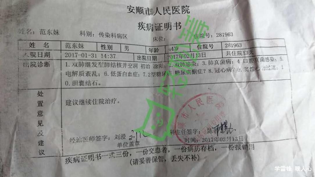 我是范东妹的大儿子,我今年24岁,是一名初中毕业就辍学打工的农民,我爸爸范东妹于2008年患上了糖尿病,期间一直在药物治疗,于2013年病重,送去医院抢救过一次,抢救回来了,又于2015年再次病重,再次去医院抢救了回来,第三次病重于2017年2月份,糖尿病诱发肺结核,大年初三送去的医院,治疗了十五天,直到再也交不出一分钱继续治疗,医院不让住了才回家静养。现于2017年4月份父亲病情再次恶化,生命危在旦夕,高昂的医药费对于我这样一个普普通通的农民家庭来说是一笔天文数字,这些年来,为了给父亲治疗,花光了家里所有的积蓄,欠下了高达数万元的外债,妈妈更是在父亲重病的时候已经离家出走了,除了打工、照顾静养在家的父亲还要照顾两个年幼的弟弟12岁、13岁,现在的我一人支撑着这个家,毫无办法,该借的亲朋好友都借了,已经凑不出一分钱来继续治疗。可医生说还有一线希望我就不会放弃,我自己在努力的同时也希望广大爱心人士,认识或不认识的朋友们帮帮我爸爸,帮助我们全家度过这个难关,也让才45岁的父亲获得再生的机会,让我两个弟弟能度过一个健康而幸福的童年。以后,我和我的两个弟弟也会涌泉相报。感谢各位好心人帮助,好人一生平安,祝好心人全家和谐幸福安康。