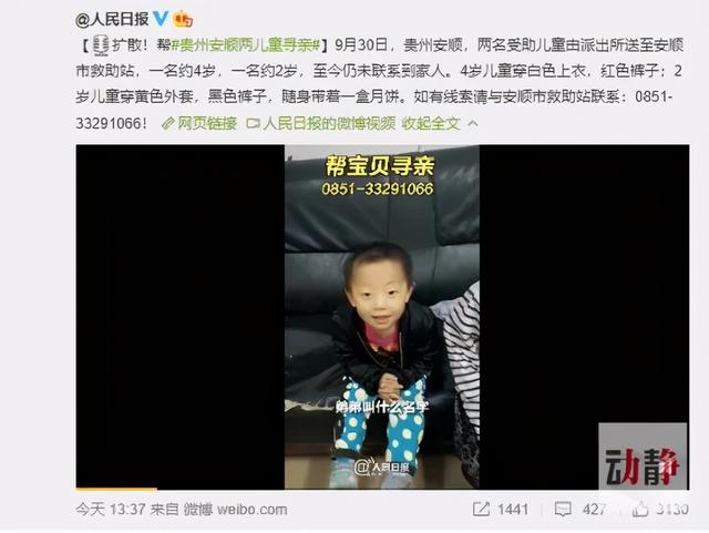 昨天(10月11日),@人民日报官方微博发布了一则“帮助贵州安顺两儿童寻亲”的消息。根据寻亲微博内容显示,9月30日,贵州安顺市西秀区轿子山派出所值班民警将两名受助男童送至安顺市救助管理站,一名约4岁,一名约2岁。其中,4岁儿童穿白色上衣,红色裤子;2岁儿童穿黄色外套,黑色裤子,随身带着一盒月饼。