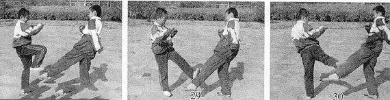 双方交战,对手突然起左低边腿攻踢我小腿,我急动应变,用左下蹬腿反踢破化来腿,同时双手屈肘回护体前,目视对手(图29)。