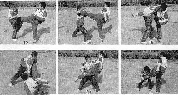 双方交战,对手突然起右中位边腿攻踢我腹肋,我急动应变,左脚向前上步,左手托抱对手的右大腿,右手钩按其头颈,同时发右顶膝狠撞对手心窝,使之受到重创(图15)。