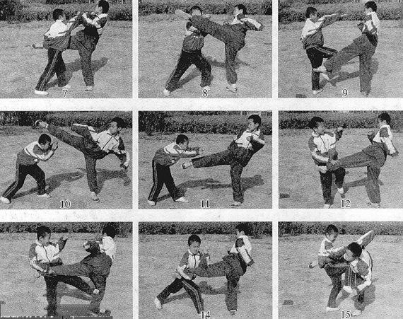 要点与提示:闪躲快速,俯身凸臀,收腹拱背,意气力相合。闪化对手边腿后,可连出右前蹬腿反踢其胸部,使之受到重创。